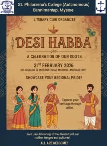 ಮೈಸೂರು:- ಅಂತರರಾಷ್ಟ್ರೀಯ ತಾಯಿ ಭಾಷಾ ದಿನದ ಅಂಗವಾಗಿ ಸಂತ ಫಿಲೋಮೀನ ಕಾಲೇಜು (ಸ್ವಾಯತ್ತ), ಬನ್ನಿಮಂಟಪದಲ್ಲಿ ಫೆಬ್ರವರಿ 21, 2026 ರಂದು ಸಾಹಿತ್ಯ ಜಾಗೃತಿ ಕಾರ್ಯಕ್ರಮವನ್ನು ಹಮ್ಮಿಕೊಳ್ಳಲಾಗಿದೆ. ಕಾಲೇಜಿನ ಓಕ್ ಜ್ಯೂಬಿಲಿ ಸಂಭ್ರಮಾಚರಣೆ (1946–2026) ಅಂಗವಾಗಿ ನಡೆಯುತ್ತಿರುವ ವಿವಿಧ ಶೈಕ್ಷಣಿಕ ಹಾಗೂ ಸಾಂಸ್ಕೃತಿಕ ಕಾರ್ಯಕ್ರಮಗಳ ಸರಣಿಯಲ್ಲಿ ಈ ಕಾರ್ಯಕ್ರಮವೂ ಒಂದಾಗಿದ್ದು, ಕಾಲೇಜಿನ ಸಾಹಿತ್ಯ ಸಂಘವು ಆಂತರಿಕ ಗುಣಮಟ್ಟ ಭರವಸೆ ಕೋಶ (ಐಕ್ಯುಎಸಿ) ಸಹಯೋಗದಲ್ಲಿ ಈ ಕಾರ್ಯಕ್ರಮವನ್ನು ಆಯೋಜಿಸಿದೆ. ಕಾರ್ಯಕ್ರಮವು ಬೆಳಿಗ್ಗೆ 11.30ಕ್ಕೆ ಕಾಲೇಜಿನ ಒಳಾಂಗಣ ಕ್ರೀಡಾಂಗಣದಲ್ಲಿ ನಡೆಯಲಿದೆ.