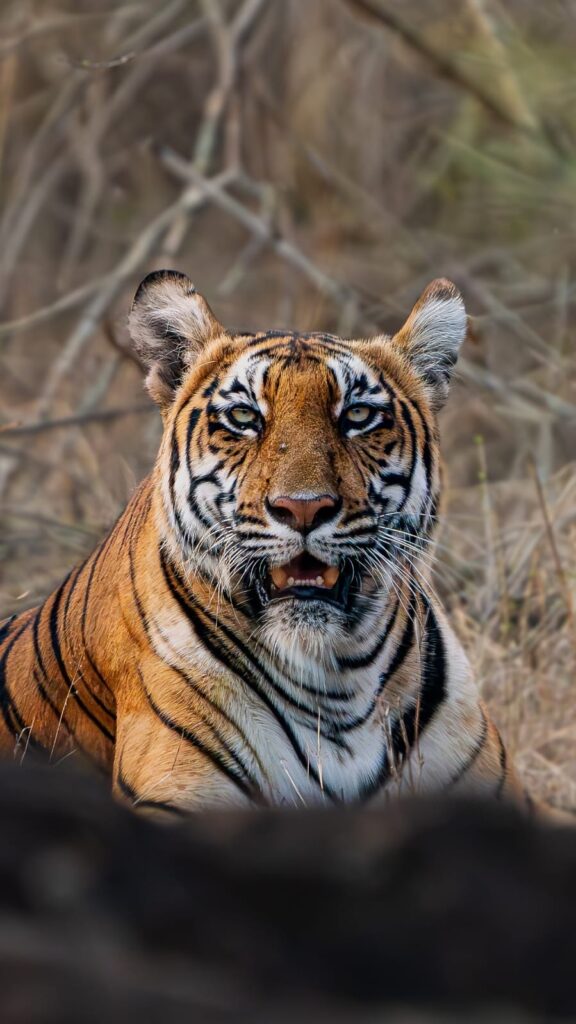 A tigress emerged—calm, commanding, and utterly sovereign. Seated beside the path, she called gently to her cubs hidden nearby. Though they remained unseen, their presence was felt.
